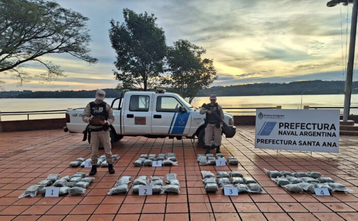 Por otra parte, ayer, personal de la Prefectura Santa Ana que realizaba patrullajes terrestres, observó a varios individuos que transportaban bultos, quienes al percatarse de la presencia policial abandonaron el cargamento y huyeron hacia el monte.