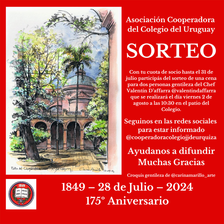 Te invitamos a hacerte socio de @cooperadoracolegiojjdeurquiza con una única cuota anual de $2000. Con tu inscripción hasta el 31 de julio estás participando del sorteo de una cena para dos personas gentileza de @valentindaffarra que se realizará el día viernes 2 de agosto a las 10:30 en el patio del Colegio