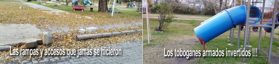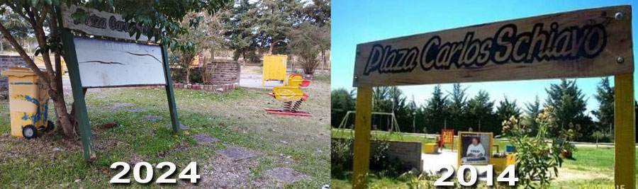 Hoy la Placita Inclusiva “Carlos Schiavo”, ubicada antes de acceso a la Defensa entre calles Tito Bonus, Perón y Artigas, presenta un aspecto muy diferente al de 2014, con falta de cuidado en el parque, pozos con barro, falta de arena, juegos rotos o mal armados y cartelería dañada, entre otras cosas.