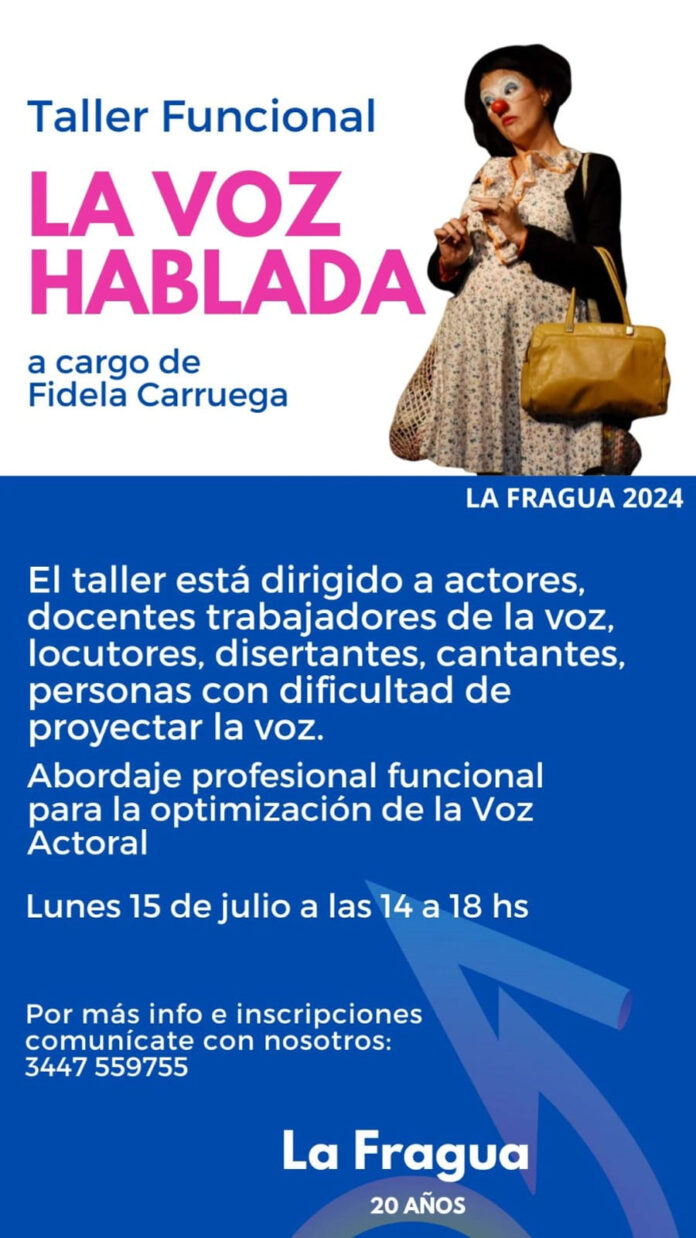 Este lunes 15 de julio a las 14 hs  se dictará un taller  titulado » Taller funcional de la Voz Hablada» el mismo está  dirigido a actores, docentes  trabajadores de la voz, locutores, disertantes, cantantes, personas con dificultad de proyectar la voz, tiene una duración de 4 hs. y será dictado por Fidela Carruega, docente con una basta experiencia y formación teatral.
