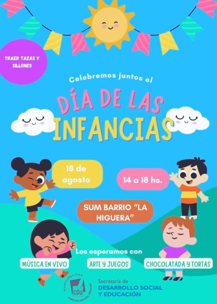 Este domingo 18 de agosto, se celebra en todo el país el Día de las Infancias. En Concepción del Uruguay, se realizarán diferentes actividades en el SUM del barrio “La Higuera”, de 14 a 18 horas. Quienes se acerquen, encontrarán música, comida, arte y juegos.