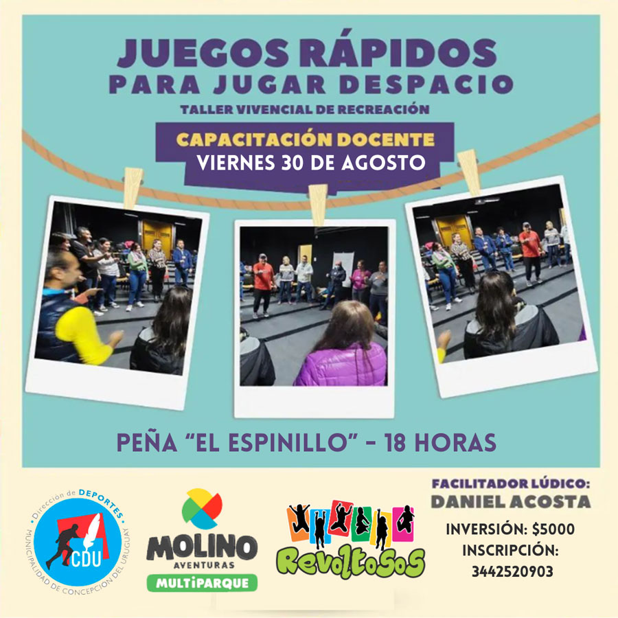Destinada a docentes de todas las materias, animadores, líderes juveniles y público en general; continúa la inscripción a todos quienes deseen participar de la capacitación vivencial titulada «JUEGOS RÁPIDOS PARA JUGAR DESPACIO». Este evento, que se llevará a cabo el próximo viernes 30 de agosto en la Peña «El Espinillo», promete ser una oportunidad única para adquirir herramientas y estrategias a través del juego.