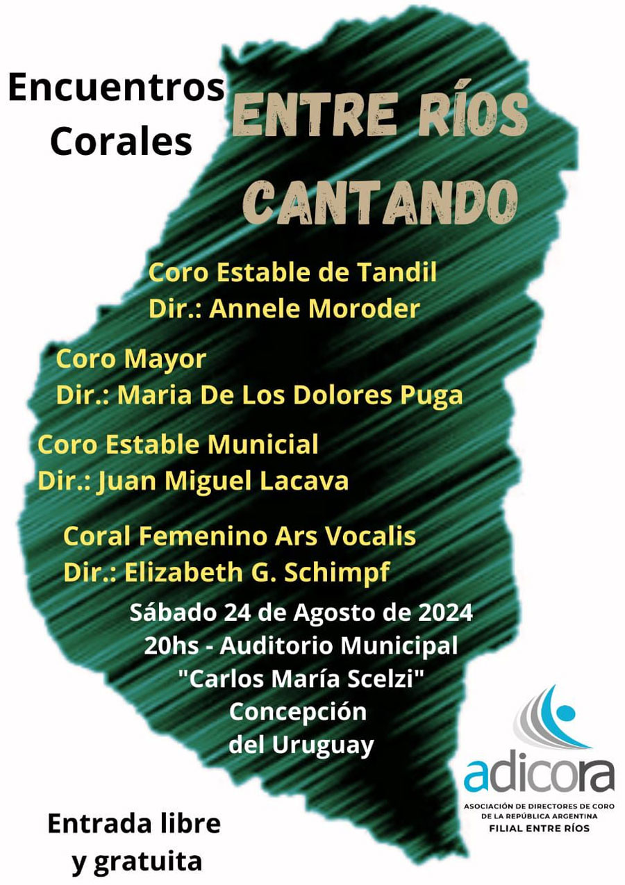Se viene el “Encuentro Coral Entre Ríos Cantando en Concepción del Uruguay”, que es organizado por ADICOER (Asoc de Directores de Coro Filial Entre Ríos).