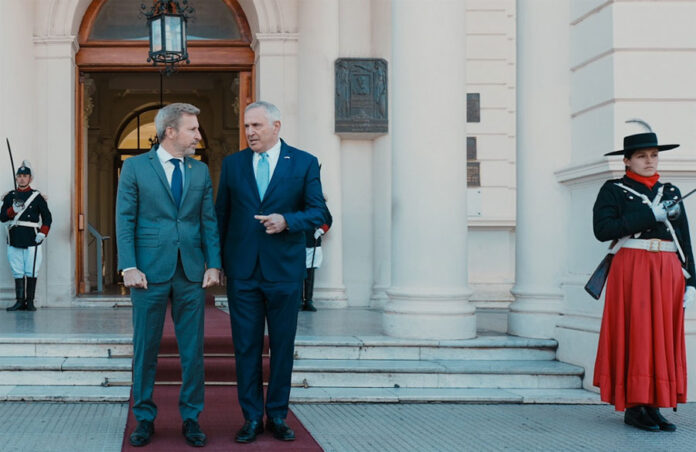 El diplomático fue recibido por el mandatario entrerriano en Plaza Mansilla, con la presencia de la Banda de Música y cadetes de la Policía de Entre Ríos.