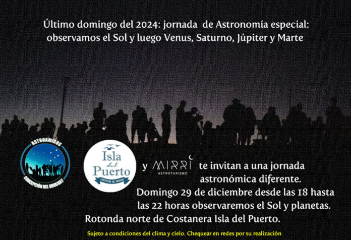 Éste último domingo del año proponemos una actividad diferente que tiene que ver con la columna: la observación del Sol; por ello, esta tarde desde las 18:00 horas plantaremos telescopios en la “Isla del Puerto”, en el sector donde siempre nos ubicamos y observaremos el Sol hasta su puesta (en éstos momentos el Sol está “precioso”: tiene unas 12 manchas perfectamente visibles con nuestros telescopios) y luego continuaremos observando los planetas Venus, Saturno, Júpiter y finalmente Marte, un verdadero combo de Astronomía. Hasta las 22:00 horas disfrutaremos del cielo.