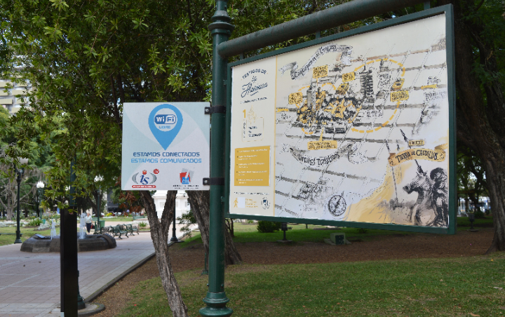 En definitiva, se trata de cartelería referida a tres circuitos de autoguiado: Tierra de Caudillos, Ciudad Cuna de la Organización Nacional, y Ciudad de la Educación y el Aprendizaje. La gráfica artística de la cartelería fue realizada por la artista local Carina Amarillo. A todo esto se suma la renovación de 4 banderolas, 2 de las cuales se ubican al Este y otras 2 al Oeste de calle 9 de Julio, con nuevos diseños también referidos tanto a la plaza como a la ciudad.