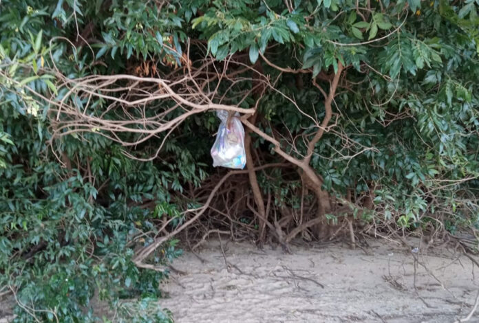 Alguien “olvidó” su basura tras pasar un lindo día de playa (para muestra, vale un botón) dejando una bolsa de residuos colgada de un árbol en la playa de Paso Vera.