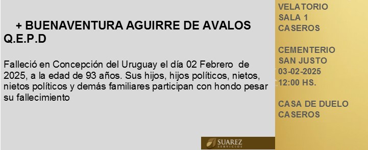 Fúnebres Buenaventura Aguirre de Ávalos QEPD febrero 3, 2025 Más Fúnebres Fúnebres José Schulman QEPD Fúnebres Matilde Primitiva Garin de Albiaque Q.E.P.D Fúnebres Norma Beatriz Colombo Vda. de Almada (Nona) Q.E.P.D.