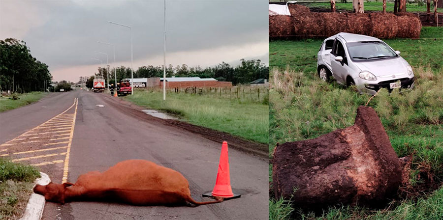 Un camión embistió a un vacuno que se cruzó en su camino, mientras que un automóvil, al intentar esquivar el animal, perdió el control y chocó contra una columna. Los ocupantes del vehículo resultaron con lesiones leves y fueron trasladados al Hospital.