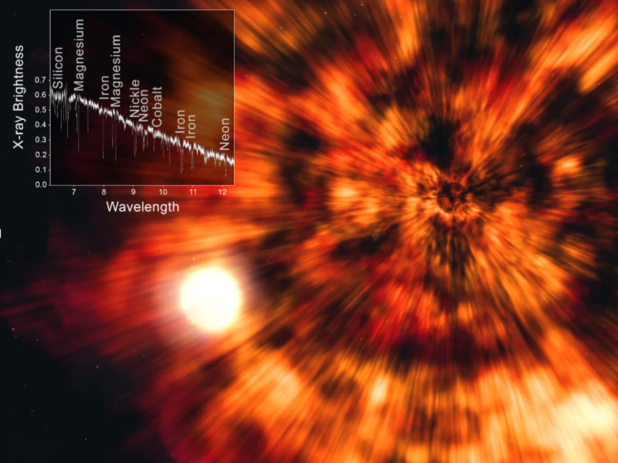 Aquí es donde entra en juego la búsqueda arqueológica de rayos X. Los astrónomos utilizaron Chandra para observar el sistema GRO J1655-40 en 2005, cuando era particularmente brillante en rayos X. Chandra detectó las firmas de elementos individuales presentes en los vientos del agujero negro mediante la obtención de espectros detallados (que proporcionan el brillo de rayos X en diferentes longitudes de onda) integrados en la luz de rayos X. Algunos de estos elementos se destacan en el espectro que se muestra en el recuadro.