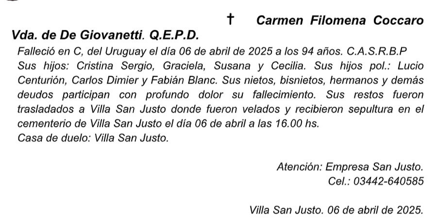 Fúnebres CARMEN FILOMENA CICCARO Vda de GIOVANETTI QEPD abril 6, 2025 Más Fúnebres Fúnebres José Schulman QEPD Fúnebres Matilde Primitiva Garin de Albiaque Q.E.P.D Fúnebres Norma Beatriz Colombo Vda. de Almada (Nona) Q.E.P.D.
