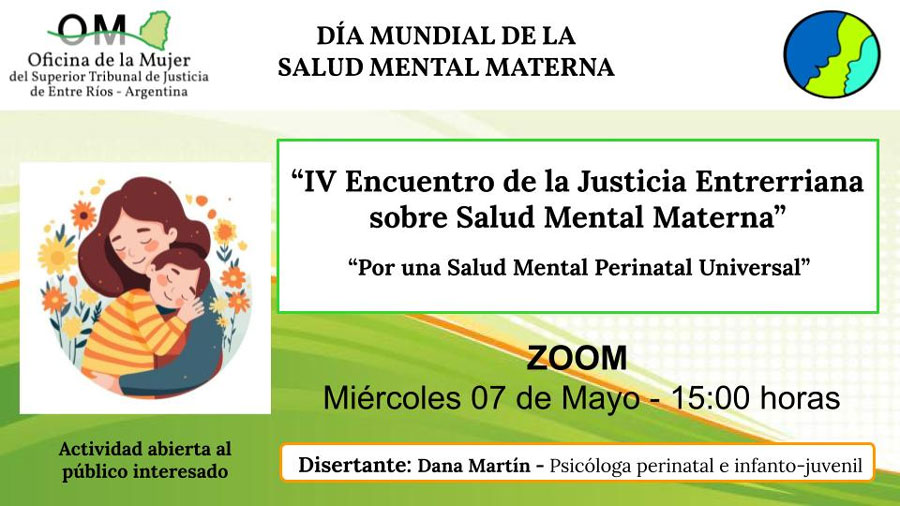 En ese marco, la Oficina de la Mujer (OM) del Superior Tribunal de Justicia de Entre Ríos (STJER) invita, por cuarto año consecutivo, a participar del “IV Encuentro de la Justicia Entrerriana sobre Salud Mental Materna “Por una Salud Mental Perinatal Universal”, el próximo 7 de mayo a las 15.