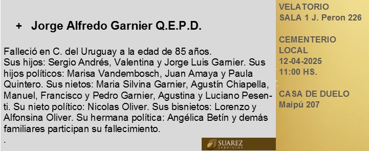 Fúnebres Jorge Alfredo Garnier QEPD abril 11, 2025 Más Fúnebres Fúnebres José Schulman QEPD Fúnebres Matilde Primitiva Garin de Albiaque Q.E.P.D Fúnebres Norma Beatriz Colombo Vda. de Almada (Nona) Q.E.P.D.