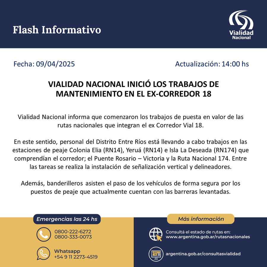 Desde la cero horas de este 9 de abril, la empresa Caminos del Río Uruguay, ya no está a cargo del corredor de las rutas Nacionales 14 y 12, por lo que la preocupación ante posible siniestros y la necesidad de urgente intervención de auxilios, ya sea mecánicos, como de salud y de limpieza, se pueden llegar a sentir.