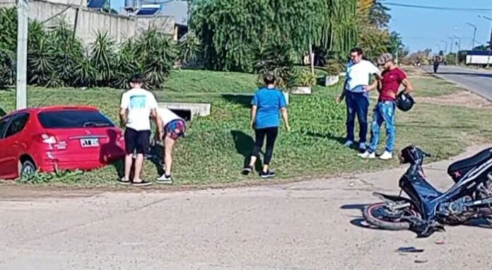 Se trató de un vehículo marca Peugeot 206, que por causas que se investigaban impactó contra una moto 110cc, provocando que el conductor del auto perdiera el control y terminara cayendo al fondo de una alcantarilla.