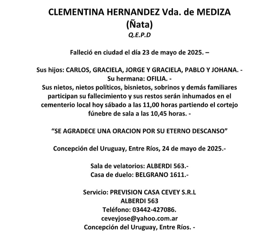 Fúnebres CLEMENTINA HERNANDEZ Vda. de MEDIZA (Ñata) QEPD mayo 23, 2025 Más Fúnebres Fúnebres Matilde Primitiva Garin de Albiaque Q.E.P.D Fúnebres Norma Beatriz Colombo Vda. de Almada (Nona) Q.E.P.D. Fúnebres María Laura Evequoz Q.E.P.D
