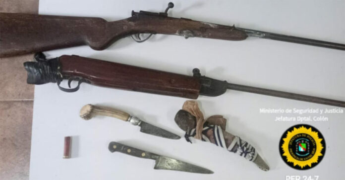 INTERVENCIÓN POLICIAL CON SECUESTROS DE ARMAS EN LA CLARITA. Pasadas las 10 horas de esta mañana, personal policial de Sub Comisaría La Clarita dependiente de Jefatura Departamental Colón, tras recibir varias llamadas a la Seccional advirtiendo que en las inmediaciones de Calle Emilio Deymonnaz se encontraba un masculino exaltado, exhibiendo armas de fuego y amenazando a los vecinos, es que se dirigieron inmediatamente al lugar, donde al estar llegando observaron un residente de 54 años, quien al percatarse de los uniformados intentó evadirlos, pero fue alcanzado a los pocos metros y contenido ya que se mostraba descontrolado.