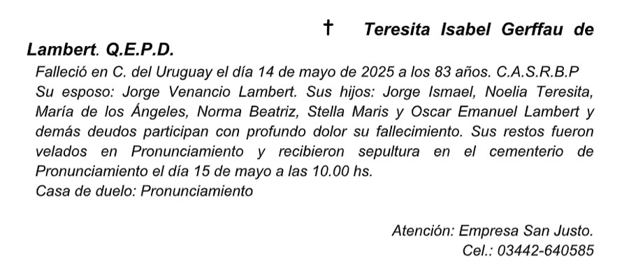 Fúnebres TERESITA ISABEL GERFFAU de LAMBERT QEPD mayo 17, 2025 Más Fúnebres Fúnebres Matilde Primitiva Garin de Albiaque Q.E.P.D Fúnebres Norma Beatriz Colombo Vda. de Almada (Nona) Q.E.P.D. Fúnebres María Laura Evequoz Q.E.P.D
