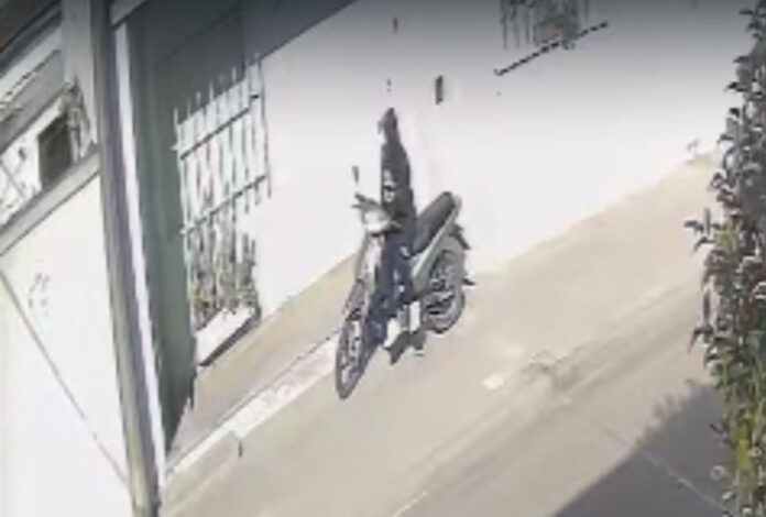 El intento de robo se produjo alrededor de las 11:45 frente a un domicilio ubicado en la intersección de calles 8 de Junio y Millán. Según quedó registrado en los registros fílmicos, el ladrón —aparentemente un joven, con el rostro cubierto por un cuello y una capucha— simuló normalidad mientras manipulaba una motocicleta marca Keller 110.
