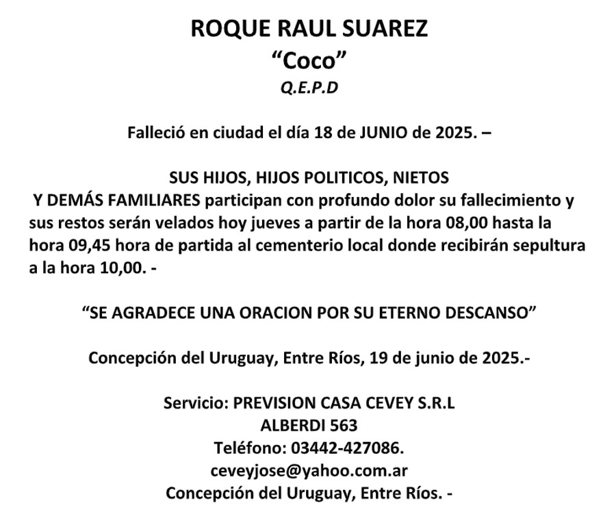 Fúnebres ROQUE RAUL SUAREZ QEPD junio 18, 2025 Más Fúnebres Fúnebres Norma Beatriz Colombo Vda. de Almada (Nona) Q.E.P.D. Fúnebres María Laura Evequoz Q.E.P.D Fúnebres Gladys Zulema Sigod de Torran (Rubia)