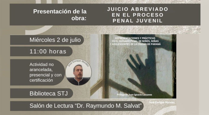 El próximo miércoles 2 de julio, a las 11, el director general del Patronato de Liberados de la provincia de Entre Ríos y representante por el Ministerio de Gobierno de Entre Ríos en el Gabinete de Control y Seguimiento de Personas en Conflicto con la Ley Penal, José Enrique Morales, presentará en el salón de lectura de la Biblioteca del Poder Judicial de Entre Ríos, su obra titulada “Juicio abreviado en el Proceso Penal Juvenil”.