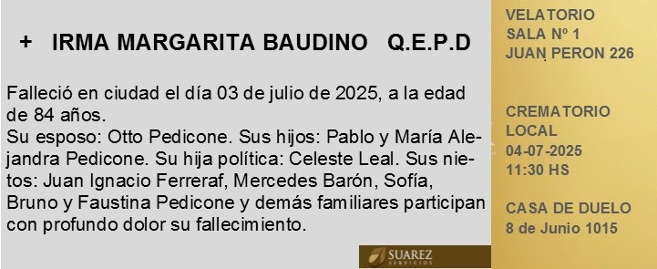 Fúnebres Irma Margarita Baudino QEPD julio 3, 2025 Más Fúnebres Fúnebres Norma Beatriz Colombo Vda. de Almada (Nona) Q.E.P.D. Fúnebres María Laura Evequoz Q.E.P.D Fúnebres Gladys Zulema Sigod de Torran (Rubia)