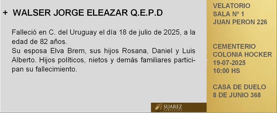 Fúnebres WALSER JORGE ELEAZAR QEPD julio 18, 2025 Más Fúnebres Fúnebres Catalina Anzaldi QEPD Fúnebres MARIA ROSA DAVICO. Vda. de GIACOPUZZI QEPD Fúnebres Maria Josefa De Zan de Menescardi QEPD