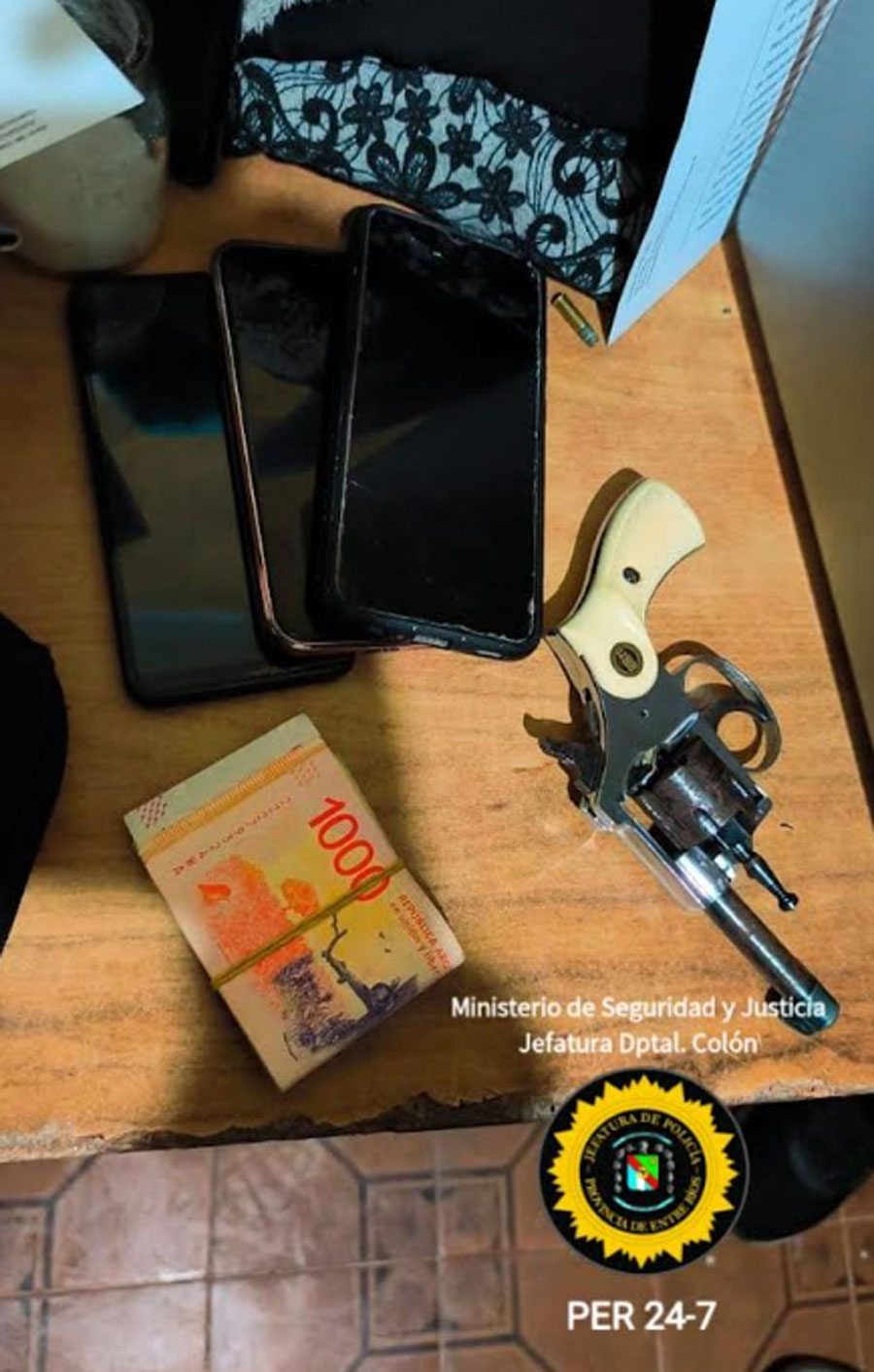 Posteriormente, se llevó a cabo un segundo allanamiento en un domicilio emplazado sobre calle Lerma al 500, del barrio Villa Tesei, en la misma localidad bonaerense. Allí se logró incautar una suma de dinero en efectivo, tres teléfonos celulares y un arma de fuego tipo revólver, marca ROHM, calibre .22, con seis cartuchos.