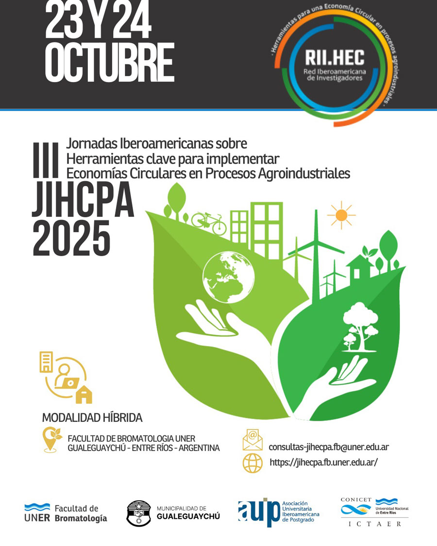 Se encuentran abiertas las inscripciones a las III Jornadas Iberoamericanas sobre Herramientas Clave para Implementar Economías Circulares en Procesos Agroindustriales (JIHECPA 2025), que se realizarán los días jueves 23 y viernes 24 de octubre de 2025 en la Facultad de Bromatología de la Universidad Nacional de Entre Ríos, en la ciudad de Gualeguaychú, Entre Ríos, Argentina; en modalidad híbrida (presencial y virtual), según Res. CD 135/2025.