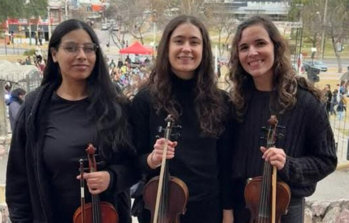 Tres violinistas de la Orquesta Río de los pájaros en Córdoba