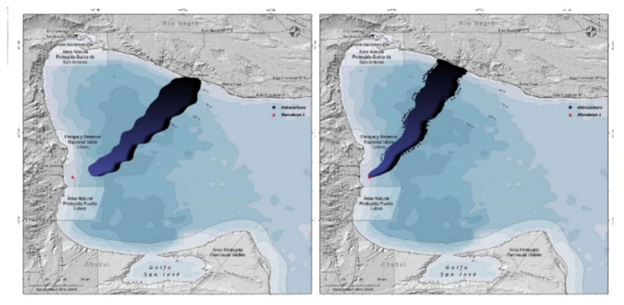 En el mapa de la izquierda se muestra el resultado de un estudio contratado por la empresa ejecutora en el contexto de aprobación del proyecto que dejaba en evidencia que los derrames podrían tener un impacto ambiental importante. Si bien el ejercicio presentado por la empresa no busca modelar escenarios de mayor intensidad o duración y tampoco indica el criterio de elección de estos escenarios, muestra coincidencias con el trabajo aquí abordado. Estos resultados no se tuvieron en cuenta, aunque predecían la posibilidad de que el derrame de petróleo llegará a la costa.