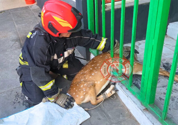 Esta mañana Bomberos fueron alertados por vecinos sobre un ciervo que quedó atrapado en las rejas de un local deportivo en 9 de Julio y bulevar Diaz Vélez.