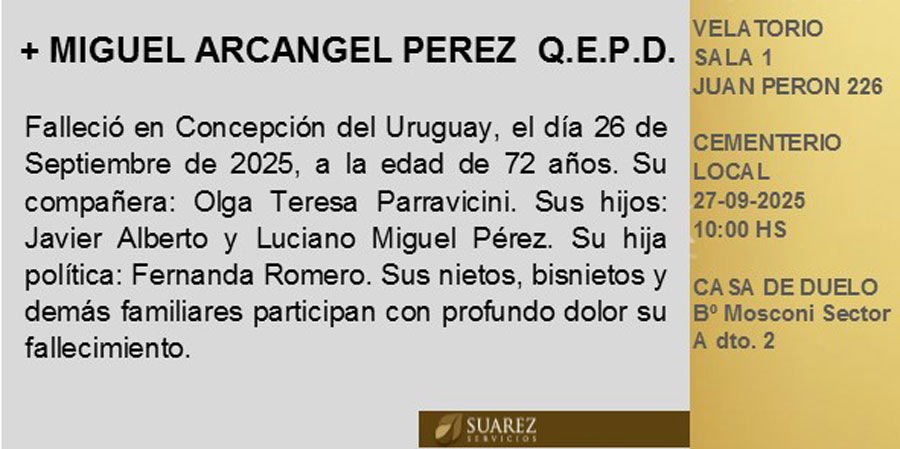 Fúnebres + MIGUEL ARCANGEL PEREZ Q.E.P.D. septiembre 26, 2025 Más Fúnebres Fúnebres Catalina Anzaldi QEPD Fúnebres MARIA ROSA DAVICO. Vda. de GIACOPUZZI QEPD Fúnebres Maria Josefa De Zan de Menescardi QEPD