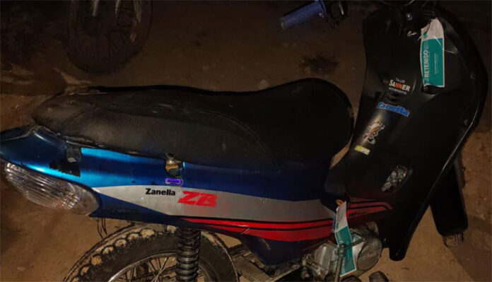 Según lo informado por Inspectores Municipales, momentos antes se había observado a un masculino circulando en una Motocicleta marca Zanella ZB 110 cc., color azul, sin dominio colocado, sin luces reglamentarias y sin casco, en la zona céntrica de Plaza Moreno. Ante la infracción, el personal municipal inició un seguimiento que culminó en el lugar mencionado, donde el conductor abandonó el rodado entre las malezas, mostrándose en todo momento exaltado.