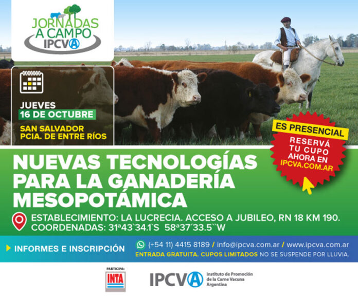 Bajo el slogan “Nuevas tecnologías para la ganadería mesopotámica”, el Instituto de Promoción de la Carne Vacuna Argentina (IPCVA) llevará a cabo una nueva Jornada a Campo en el Establecimiento La Lucrecia de San Salvador, Provincia de Entre Ríos (Acceso a Jubileo, Ruta Nacional 18 Km 190) el próximo jueves 16 de octubre de 2025.