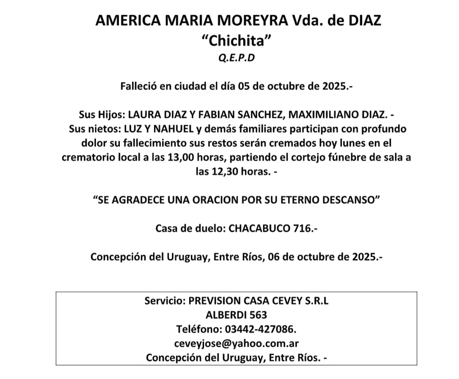 Fúnebres AMERICA MARIA MOREYRA Vda de DIAS «Chichita» QEPD octubre 5, 2025 Más Fúnebres Fúnebres Catalina Anzaldi QEPD Fúnebres MARIA ROSA DAVICO. Vda. de GIACOPUZZI QEPD Fúnebres Maria Josefa De Zan de Menescardi QEPD