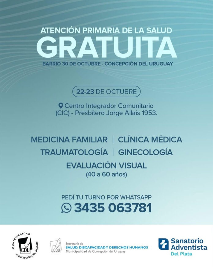 El Sanatorio Adventista del Plata, junto con un equipo de médicos de la red AdventHealth (EE. UU.), y en coordinación con la Municipalidad de Concepción del Uruguay, mediante la Secretaria de Salud, Discapacidad y Derechos Humanos, realizarán dos jornadas de atención primaria de la salud gratuita en el Centro Integrador Comunitario (CIC) «Bartolomé Zapata» ubicado en el barrio 30 de Octubre.
