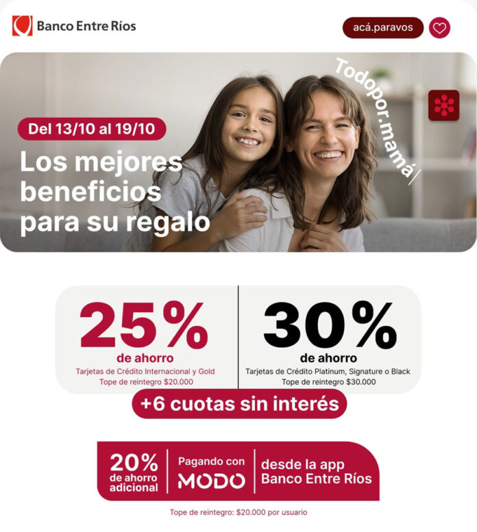En el marco de una nueva edición del Día de la Madre, el Banco Entre Ríos anunció una serie de beneficios especiales para quienes realicen sus compras con tarjetas de crédito de la entidad y lo combinen con MODO. Hasta el 19 de octubre, los clientes podrán acceder a hasta 30% de ahorro y 6 cuotas sin interés en una amplia red de comercios adheridos de toda la provincia.