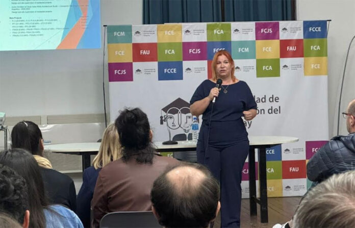 La arquitecta Valeria Rivas disertó este martes en la UCU sobre su experiencia profesional en Frankfurt, Alemania. Destacó la sostenibilidad, la importancia de fachadas y cubiertas verdes, el uso del agua y la emanación de calor.