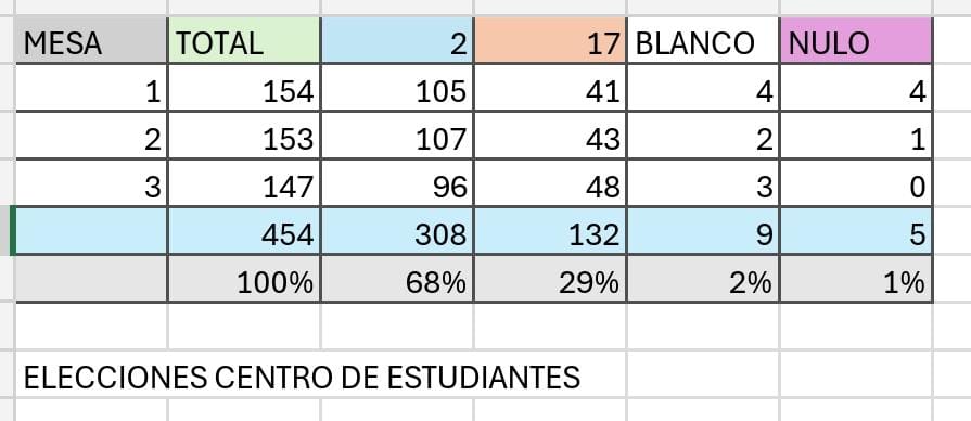 El “Frente UADER Entre Tod@s” se impuso al obtener el 68% de los votos válidos, lo que representa un total de 308 sufragios. La Lista 17 “Unión de Juventudes por el Socialismo”, que también se presentó a la contienda, alcanzó el 29% de los votos, sumando 132 adhesiones. La jornada registró un total de 454 votos emitidos, de los cuales 2% fueron en blanco y 1% nulos.