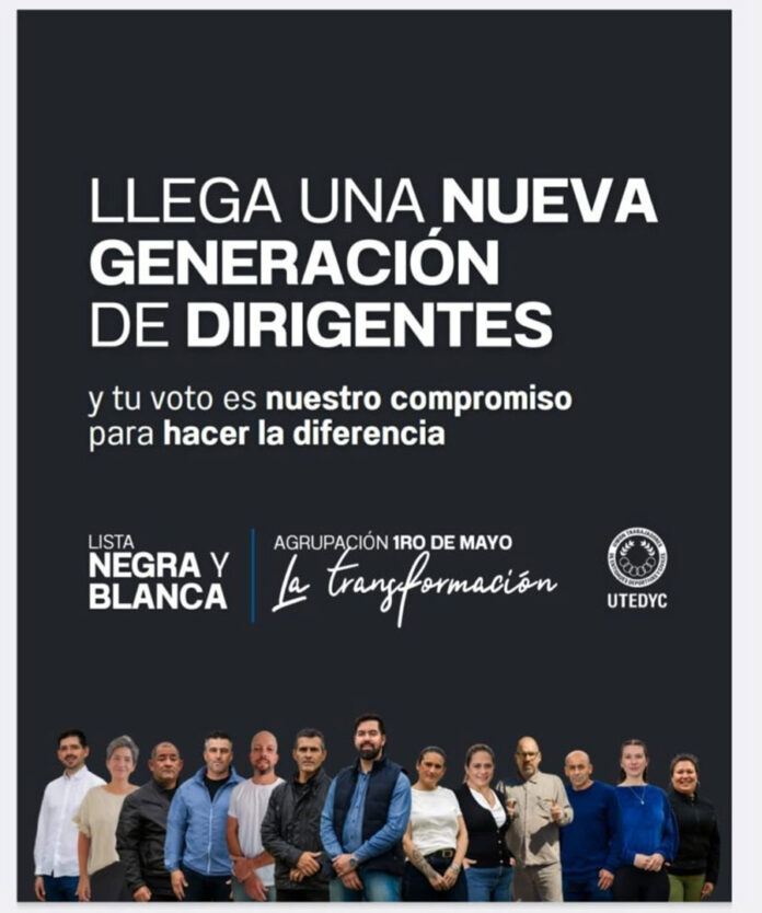 De cara al jueves 30 de octubre, día en que se realizarán las elecciones en todo el país de UTEDYC, la lista Primero de Mayo – La Transformación “Negra y blanca”, encabezada por Alexander Taborda como secretario general, recorre cada punto de la provincia haciendo llegar su propuesta a los afiliados con una muy buena recepción, según se comenta en los pasillos de las entidades visitadas.