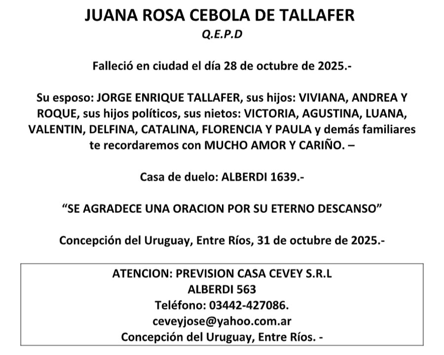 Fúnebres JUANA ROSA CEBOLA de TALLAFER QEPD octubre 30, 2025 Más Fúnebres Fúnebres Antonio “Kiko” Toneguzzo QEPD Fúnebres ARMANDO ROBERTO PLANO QEPD Fúnebres Horacio Raul Krenz (el Burro), el Tata para sus nietos.Q.E.P.D
