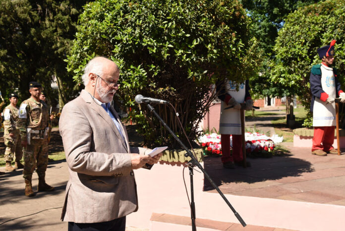 El discurso alusivo a la fecha estuvo a cargo del arquitecto Carlos Canavessi, integrante del Centro Cultural Urquiza de nuestra ciudad. En su alocución, Canavessi evocó los orígenes de Urquiza recordando que “Entre Ríos aún no era una provincia cuando el matrimonio formado por don Josef Narciso de Urquiza y doña Cándida García decidió abandonar Buenos Aires y radicarse en campos entrerrianos”. Describió con calidez el nacimiento del prócer en 1801, “cuando la primavera ya había coloreado de dorado los talas y espinillos”, y su infancia en un entorno rural que forjaría su carácter “tenaz y fuerte como el ñandubay”. Canavessi destacó que desde temprana edad Urquiza aprendió los valores del trabajo, la prudencia y la libertad, virtudes que lo acompañarían durante toda su vida pública.