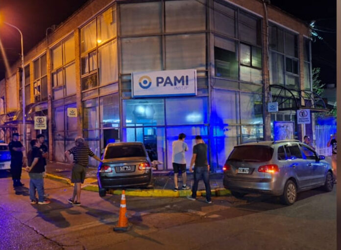 El automóvil Chevrolet Corsa a raíz del accidente termina impactando en las instalaciones del PAMI, produciendo daños de consideración.