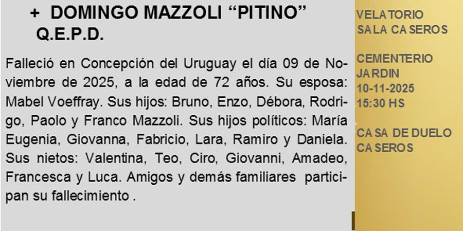 Fúnebres DOMINGO MAZZOLI (Pitino) QEPD noviembre 9, 2025 Más Fúnebres Fúnebres MARIA ROSA DAVICO. Vda. de GIACOPUZZI QEPD Fúnebres Maria Josefa De Zan de Menescardi QEPD Fúnebres DINA MERCEDESZAMBIANCHI Q.E.P.D.