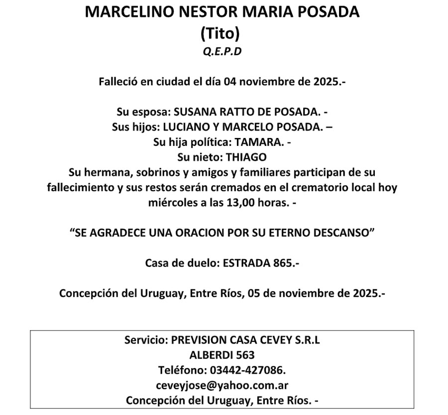 Fúnebres MARCELINO NESTOR MATIA POSADA (Tito) QEPD noviembre 4, 2025 Más Fúnebres Fúnebres MARIA ROSA DAVICO. Vda. de GIACOPUZZI QEPD Fúnebres Maria Josefa De Zan de Menescardi QEPD Fúnebres DINA MERCEDESZAMBIANCHI Q.E.P.D.