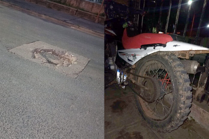 El episodio ocurrió en horas de la noche de este martes, frente a la planta de YPF. El motociclista no advirtió un pozo de gran tamaño en el medio de la calzada y terminó impactando de lleno, lo que provocó la rotura de la amortiguación de su rodado.