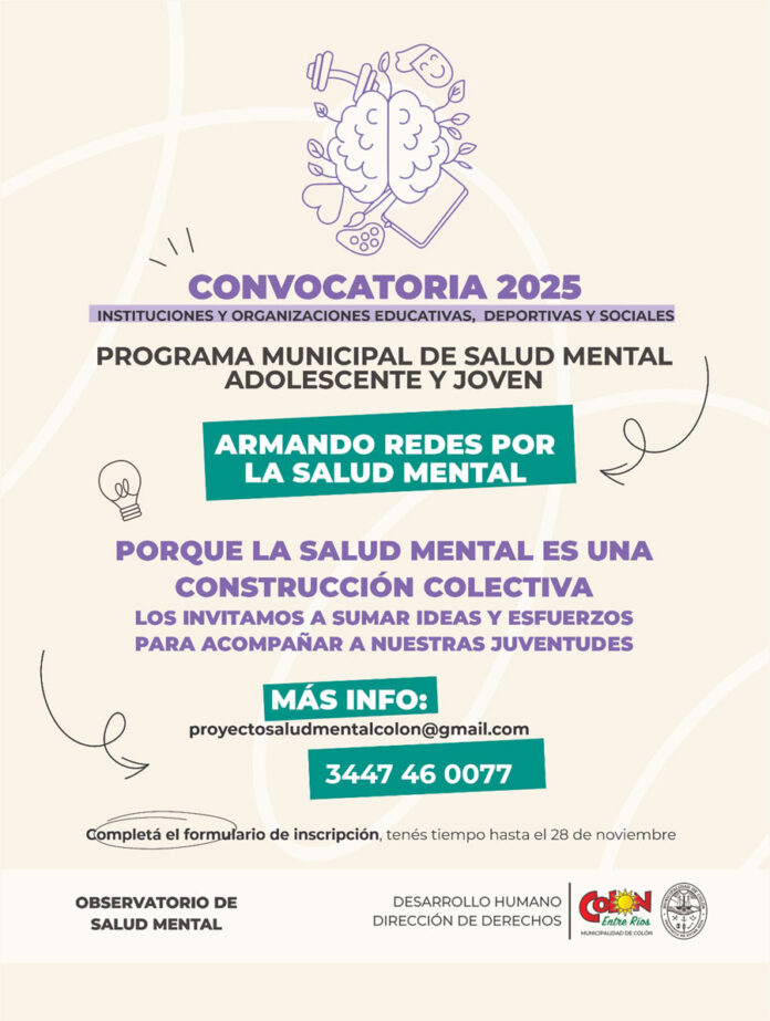 La Municipalidad de Colón, a través de la Secretaría de Desarrollo Humano, convoca a instituciones educativas, clubes deportivos, asociaciones civiles, y fundaciones a presentar proyectos orientados al bienestar psicoemocional de adolescentes y jóvenes.