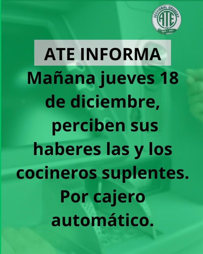 Mañana, jueves 18 de diciembre, perciben sus haberes las y los cocineros suplentes, por cajero automático.