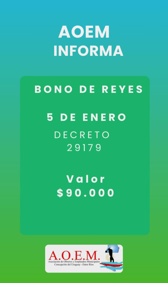 Mediante Decreto N° 29.179, la Municipalidad de Concepción del Uruguay dispuso conceder «un bono de Reyes de $90.000 para todo el personal municipal de planta permanente, contratado y contratado temporario».